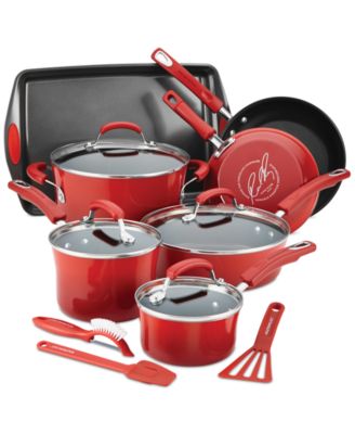 The Rachael Ray 10-Piece Stainless Steel Cookware Set includes all of the pans needed for a well equipped kitchen. Included are saucepans, a stockpot, skillets, a saute pan, a straight-sided wide pan . The riveted, silicone handles stay cool for easy handling. Glass lids allow undisturbed monitoring. This set is oven-safe up to 400 degrees F. After use, this set should be hand washed.